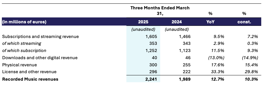 Recorded Music revenue for the first quarter of 2025 was €2,241 million, up 12.7% year-over-year, or 10.3% in constant currency. Subscription revenue grew 11.5% year-over-year, or 9.3% in constant currency, primarily driven by the growth in global subscribers. Streaming revenue grew 2.9% year-over-year, or 0.3% in constant currency, as consumption continues to shift from better monetized video platforms to short-form platforms, which are not yet as well monetized. Physical revenue increased by 17.6% year-over-year, or 15.4% in constant currency, driven by vinyl sales growth in the U.S. and Europe. Downloads and other digital revenue declined 13.0% year-over-year, or 14.9% in constant currency, as download sales continue their industry-wide decline. License and other revenue increased 33.3% year-over-year, or 29.8% in constant currency, driven by particularly strong live income in certain markets, as well as by growth in synchronisation income. Top sellers for the quarter included releases from Kendrick Lamar, Sabrina Carpenter, Lady Gaga, The Weeknd and Mrs. GREEN APPLE, while top sellers in the prior-year quarter included releases from Taylor Swift, Noah Kahan, Morgan Wallen, Ariana Grande and Olivia Rodrigo.