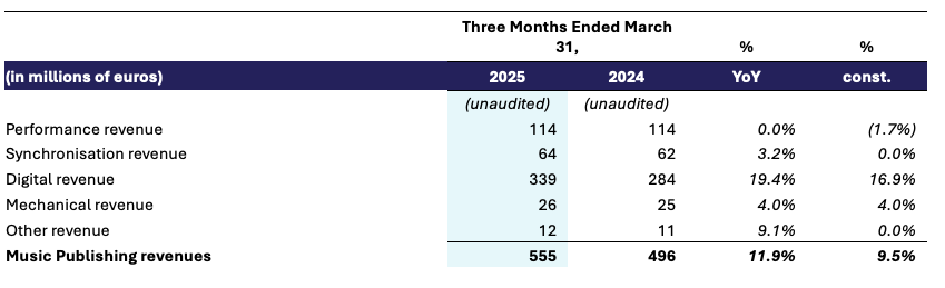 Music Publishing revenue for the first quarter of 2025 was €555 million, up 11.9% year-over-year, or 9.5% in constant currency. Digital revenue grew 19.4% year-over-year, or 16.9% in constant currency, driven by continued growth in streaming and subscription revenue. Performance revenue was flat year-over-year, but declined 1.7% in constant currency, with a difficult comparison against higher society payments in the U.S. and stronger live activity in Europe in the prior year quarter. Synchronization revenue increased 3.2% year-over-year, and was flat in constant currency. Mechanical revenue grew by 4.0% on both a reported and constant currency basis.
