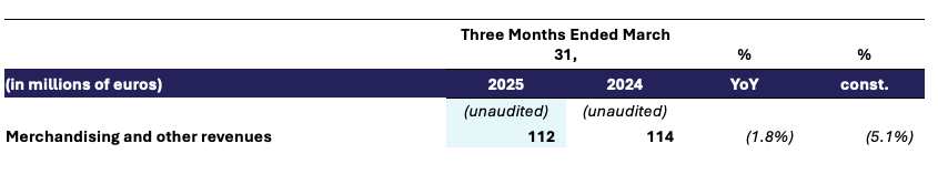 Merchandising and Other revenue in the first quarter of 2025 was €112 million, a decrease of 1.8% year-over-year, or 5.1% in constant currency, as timing-related declines in touring merchandise sales were partially offset by healthy growth in direct-to-consumer sales.