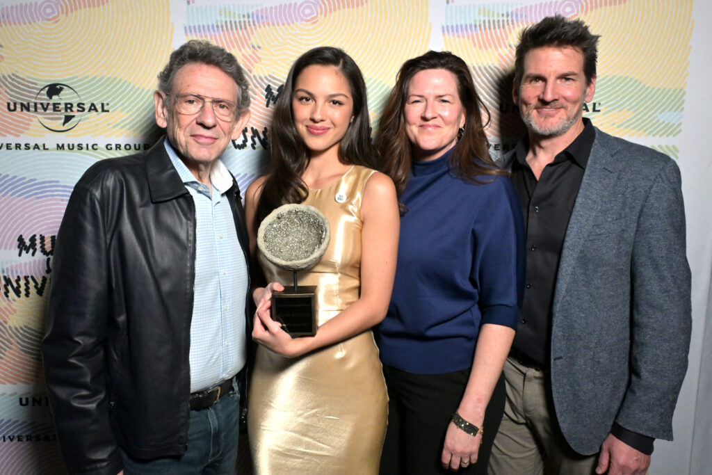 LOS ANGELES, CALIFORNIA – JANUARY 31: (L-R) Sir Lucian Grainge, Chairman and CEO of Universal Music Group, Olivia Rodrigo, Lauren Sullivan and Adam Gardner at Sir Lucian Grainge’s 2026 Music Is Universal Artist Showcase at Nya Studios on January 31, 2026 in Los Angeles, California. (Photo by Lester Cohen/Getty Images for Universal Music Group)