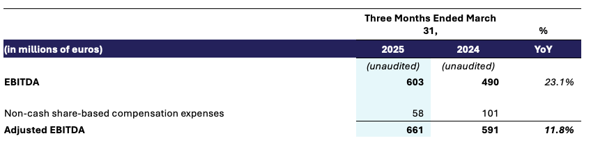EBITDA for the quarter grew 23.1% year-over-year, or 21.6% in constant currency, to €603 million and EBITDA margin was 20.8%, compared to 18.9% in the first quarter of 2024. The margin improvement is a result of lower non-cash share-based compensation expenses of €58 million during the first quarter of 2025, compared to €101 million during the first quarter of 2024. Excluding non-cash share-based compensation expenses, Adjusted EBITDA for the quarter was €661 million, up 11.8% year-over-year, or 10.0% in constant currency, driven by revenue growth. Adjusted EBITDA margin was 22.8%, consistent with the first quarter of 2024, as the positive impact of operating leverage and cost savings related to our previously announced strategic realignment were offset by the negative impact of revenue and repertoire mix.